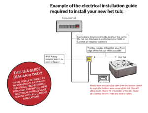 The installation of electrical supplies is heavily regulated within the UK. Installation of the electrical supply must be undertaken by a certified electrician. Installation certificates must be provided prior to the connection of the hot tub to the electrical supply. Always ensure that all electrical installations are in accordance with local regulations. Whilst only to be used as a guide you can review our Electrical installation guide below.