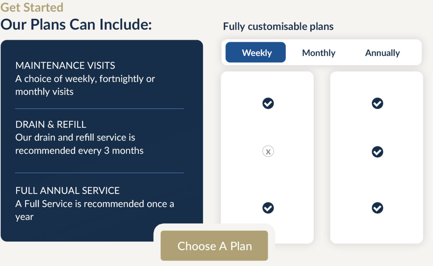 From just a yearly service to quarterly drain and refills all the way to weekly visits, we have membership plans that suit. If our pre-designed service or maintenance plans don’t quite match with what you require, we would be happy to craft a bespoke service plan for you.