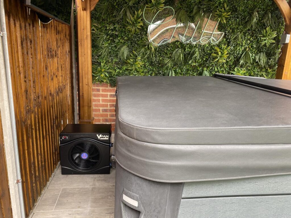 The Vian C5+ Air Source Heat Pump, small and compact enough to be installed out of sight yet capable enough to keep the average sized hot tub to 40 degrees C all year round.